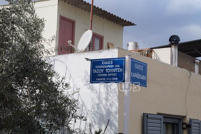 Σε φορτισμένο κλίμα συγκίνησης αναμεμιγμένο με το αίσθημα της Εθνικής υπερηφάνειας και με τραγικά πρόσωπα την οικογένεια του ήρωα Τάσου Τουλίτση, έγινε το ετήσιο μνημόσυνο και η μετονομασία από τον Δήμο Μεταμόρφωσης της διαδημοτικής οδού Αρτης (Μεταμόρφωση & Νέα Φιλαδέλφεια) αλλά και τόπου κατοικίας του, σε “Οδό Υποπλοιάρχου Π.Ν. Τάσου Τουλίτση (Κίναρος 11.02.2016)”, την Κυριακή 12 Φεβρουαρίου 2017. Στην εκδήλωση παραβρέθηκαν οι Δήμαρχοι Μεταμόρφωσης και Φιλαδέλφειας-Χαλκηδόνας κ.κ.  Μιλτιάδης Καρπέτας & Άρης Βασιλόπουλος, οι οποίοι έκαναν τα αποκαλυπτήρια των πινακίδων του νέου ονόματος της οδού.