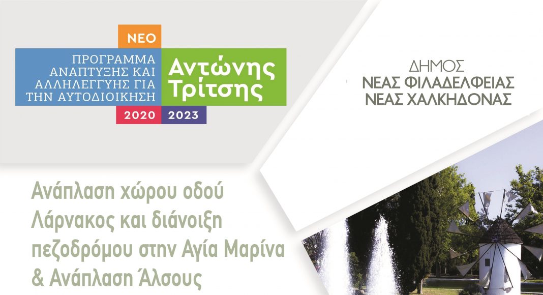Ενημερώνουμε τους συμπολίτες μας για την ένταξη του έργου, «Αστική Αναζωογόνηση στον Δήμο Νέας Φιλαδέλφειας – Νέας Χαλκηδόνας» στο Πρόγραμμα «ΑΝΤΩΝΗΣ ΤΡΙΤΣΗΣ» και συγκεκριμένα στον Άξονα Προτεραιότητας «Ποιότητα ζωής και εύρυθμη λειτουργία των πόλεων, της υπαίθρου και των οικισμών» συνολικού προϋπολογισμού 963.904,60 €, έπειτα από σχετική απόφαση του Αναπληρωτή Υπουργού Εσωτερικών, κ. Στέλιου Πέτσα.
