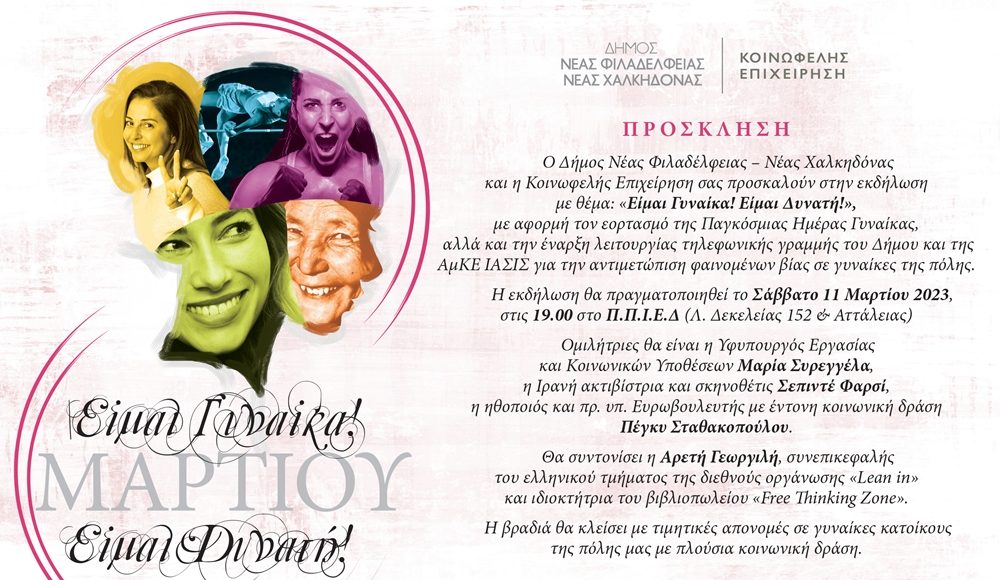 Ο Δήμος Νέας Φιλαδέλφειας – Νέας Χαλκηδόνας και η Κοινωφελής Επιχείρηση, σας προσκαλούν στην εκδήλωση με θέμα: «Είμαι Γυναίκα! Είμαι Δυνατή!», με αφορμή την παγκόσμια ημέρα της γυναίκας, αλλά και την έναρξη λειτουργίας της τηλεφωνικής γραμμής του Δήμου και της ΑμΚΕ ΙΑΣΙΣ για την αντιμετώπιση φαινομένων βίας σε γυναίκες της πόλης.