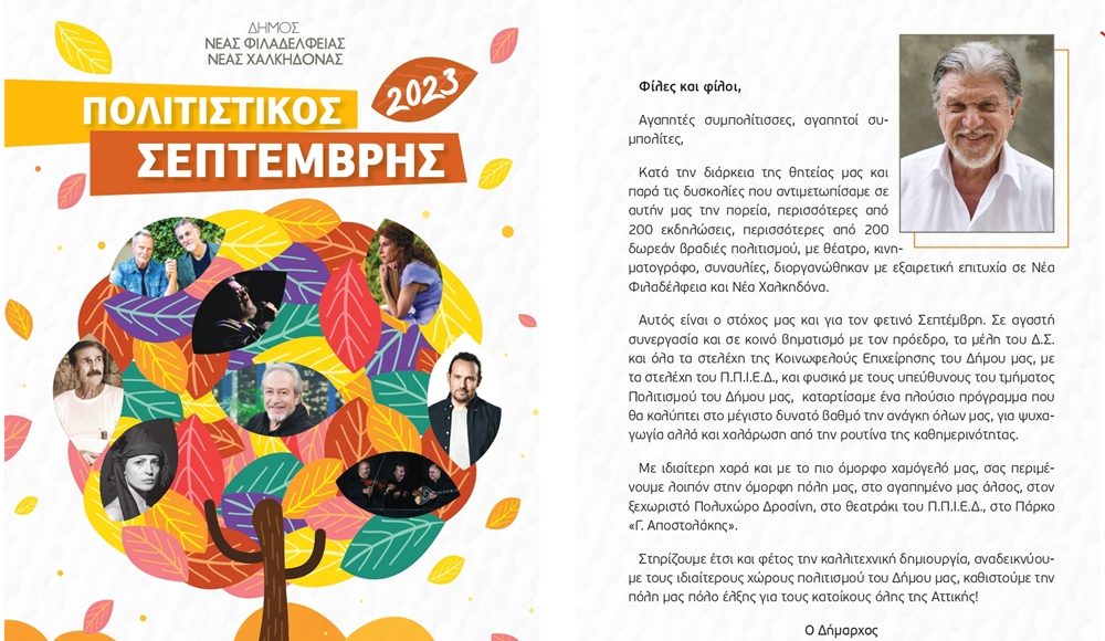 Με ιδιαίτερη χαρά παρουσιάζουμε τον δεύτερο κύκλο των πολιτιστικών εκδηλώσεων που διοργανώνει για το 2023 ο Δήμος Νέας Φιλαδέλφειας – Νέας Χαλκηδόνας. Είκοσι ακόμη ξεχωριστές βραδιές για όλες τις συμπολίτισσές μας, για όλους τους συμπολίτες μας. Είκοσι ακόμη βραδιές ψυχαγωγίας, διασκέδασης αλλά και μνήμης.