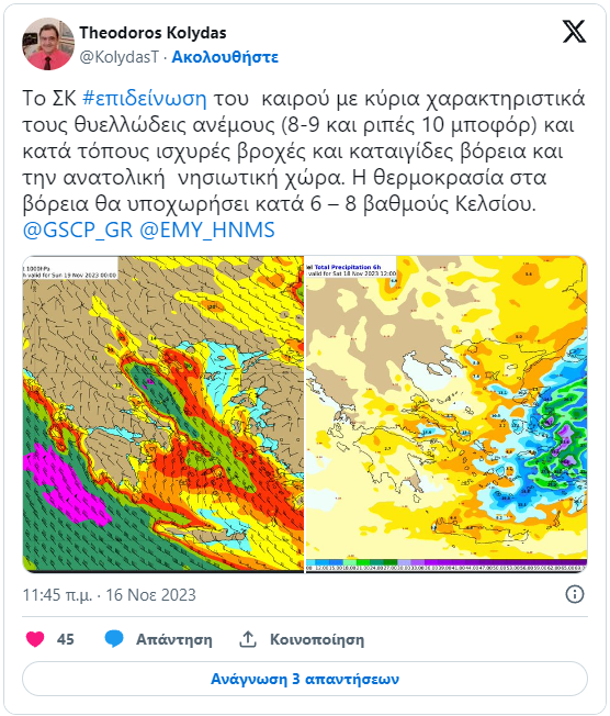 Νωρίτερα, ο Θοδωρής Κολυδάς ανέφερε ότι μέσα στο Σαββατοκύριακο θα πάρουμε μια γερή δόση χειμώνα με βροχές και σημαντική πτώση της θερμοκρασίας.