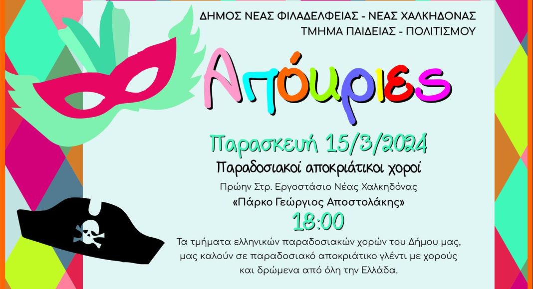 Το Τμήμα Παιδείας – Πολιτισμού του Δήμου Νέας Φιλαδέλφειας – Νέας Χαλκηδόνας διοργανώνει τριήμερο εορταστικών εκδηλώσεων για τις Απόκριες και την Καθαρά Δευτέρα με μουσική, χορό, κέφι, χαρά, φαντασία και παραδοσιακά εδέσματα.