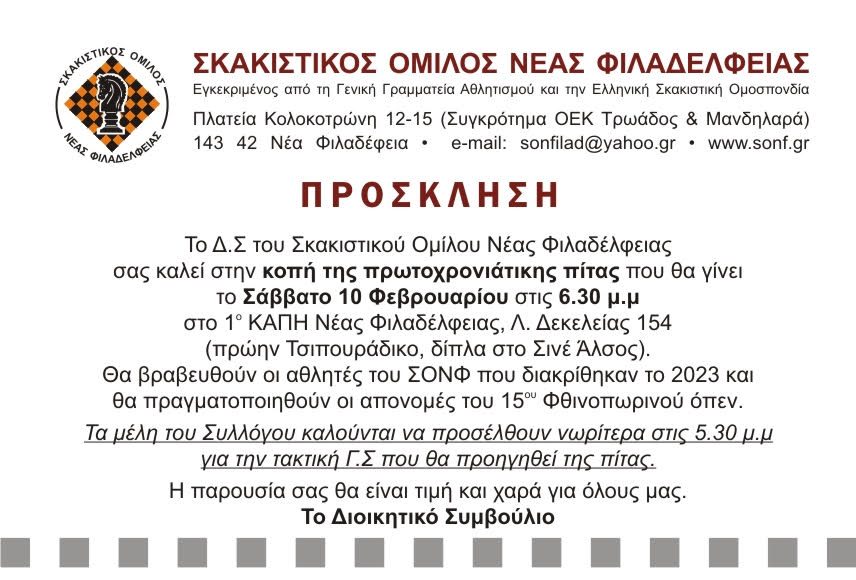 Το Σάββατο 10 Φλεβάρη θα πραγματοποιηθεί η γενική συνέλευση και κοπή πίτα του Σκακιστικού ομίλου Νέας Φιλαδέλφειας.
