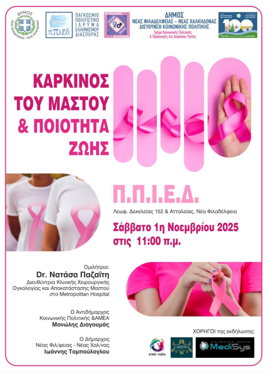 Ο Δήμος Νέας Φιλαδέλφειας – Νέας Χαλκηδόνας, πιστός στη δέσμευσή του για δράσεις που προάγουν την υγεία και την πρόληψη, διοργανώνει εκδήλωση με θέμα «Καρκίνος του Μαστού και Πρόληψη Ζωής», με αφορμή την Παγκόσμια Ημέρα κατά του Καρκίνου του Μαστού.
