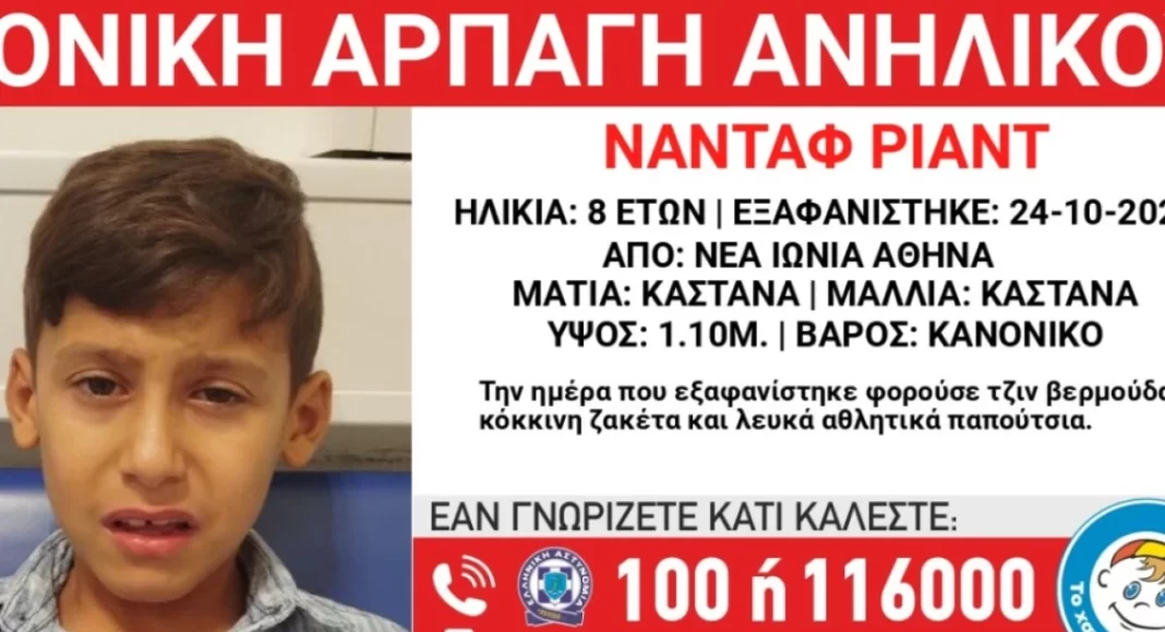 Συναγερμός έχει σημάνει από το βράδυ της Παρασκευής (24/10) για την εξαφάνιση του 8χρονου Ναντάφ Ριάντ από τη Νέα Ιωνία.