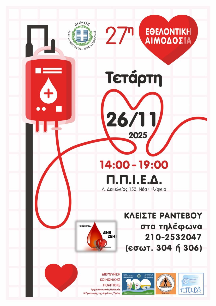 Η 27η Εθελοντική Αιμοδοσία του Δήμου Νέας Φιλαδέλφειας – Νέας Χαλκηδόνας πλησιάζει και καλεί τους δημότες να δώσουν ένα δυνατό μήνυμα κοινωνικής αλληλεγγύης και προσφοράς.