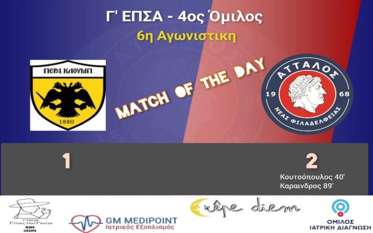 Ο Άτταλος Νέας Φιλαδέλφειας πέτυχε μια σπουδαία εκτός έδρας νίκη με 2-1 επί της Πέρα Κλουμπ, αποτέλεσμα που τον κρατά σταθερά στην κορυφή της βαθμολογίας.