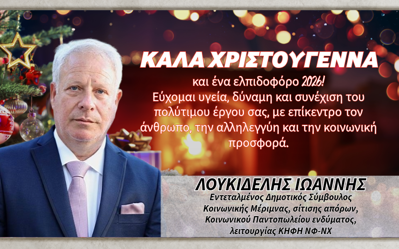 blogΕορταστικές Ευχές Χριστουγέννων & ΠρωτοχρονιάςΠΡΩΤΟΣΕΛΙΔΟ Χριστουγεννιάτικες ευχές από τον Ιωάννη Λουκιδέλη με μήνυμα κοινωνικής προσφοράς και αλληλεγγύης Από Fx-news - 24 Δεκεμβρίου 2025 0 Το δικό του μήνυμα αγάπης, ελπίδας και κοινωνικής ευθύνης στέλνει, με αφορμή τις Άγιες Ημέρες των Χριστουγέννων, ο Λουκιδέλης Ιωάννης, απευθυνόμενος σε όλους τους πολίτες με λόγια που αναδεικνύουν τη σημασία της προσφοράς και της αλληλεγγύης. Related posts: Χριστουγεννιάτικες ευχές από τον Δήμαρχο Νέας Φιλαδέλφειας – Νέας Χαλκηδόνας Ιωάννη Τομπούλογλου Ευχές Χριστουγέννων & Πρωτοχρονιάς από τον Γιάννη Βούρο Ευχές από τον Γιώργο Κελλίδη για Καλά Χριστούγεννα και ένα φωτεινό 2026 Καλά Χριστούγεννα από τον Ηλία Επιτρόπου – Ευχές στους κατοίκους της Νέας Φιλαδέλφειας