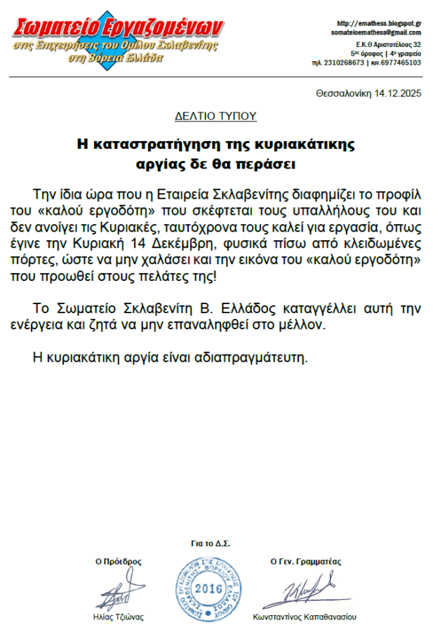 Με δελτίο τύπου που έδωσε στη δημοσιότητα, το Σωματείο Εργαζομένων στις Επιχειρήσεις του Ομίλου Σκλαβενίτη στη Βόρεια Ελλάδα καταγγέλλει πρακτικές που, όπως αναφέρει, καταστρατηγούν την κυριακάτικη αργία.