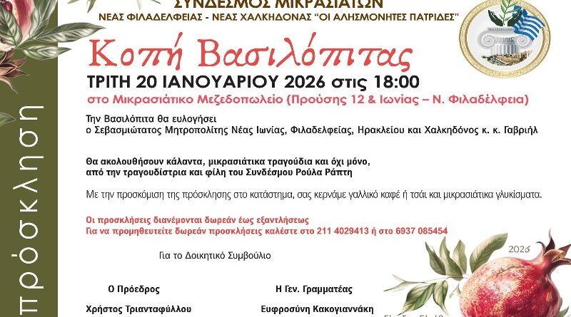 Την Τρίτη 20 Ιανουαρίου 2026, στις 18:00, ο Σύνδεσμος Μικρασιατών Ν. Φιλαδέλφειας – Νέας Χαλκηδόνας Οι Αλησμόνητες Πατρίδες προσκαλεί μέλη και φίλους στην κοπή της Βασιλόπιτας, σε ζεστό και αυθεντικά μικρασιάτικο περιβάλλον.