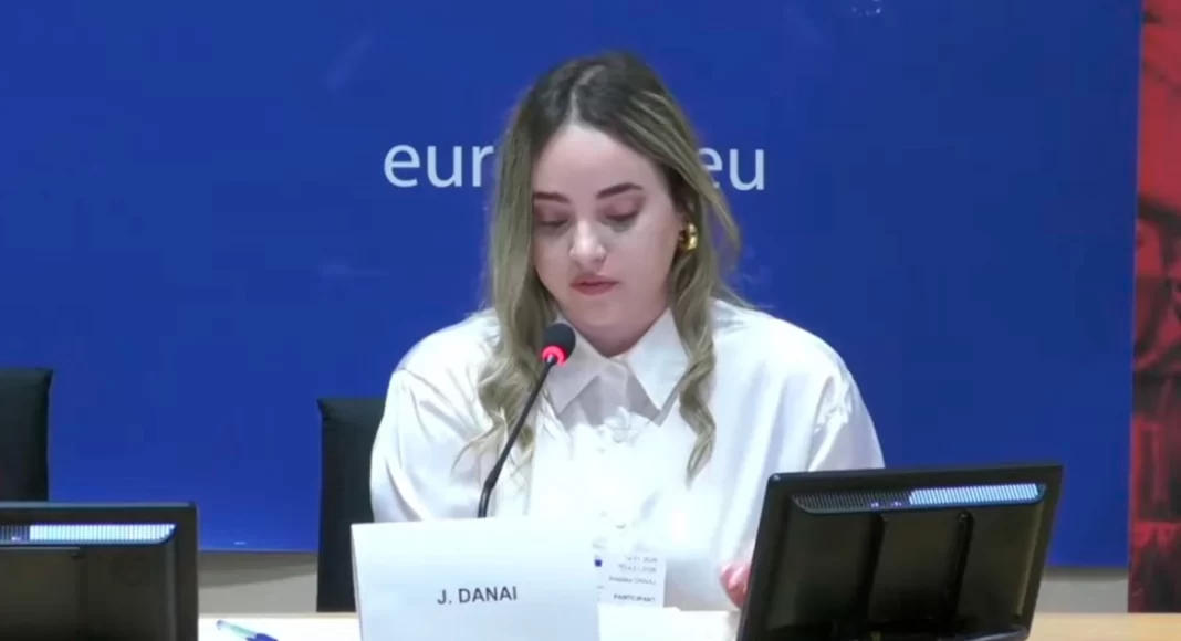 Φορτισμένη αλλά αποφασιστική, η νεαρή γυναίκα ανέβηκε στο βήμα του Ευρωπαϊκό Κοινοβούλιο στο πλαίσιο της εκδήλωσης «Γυναικοκτονίες: 8+1 Ιστορίες στο Ευρωπαϊκό Κοινοβούλιο».