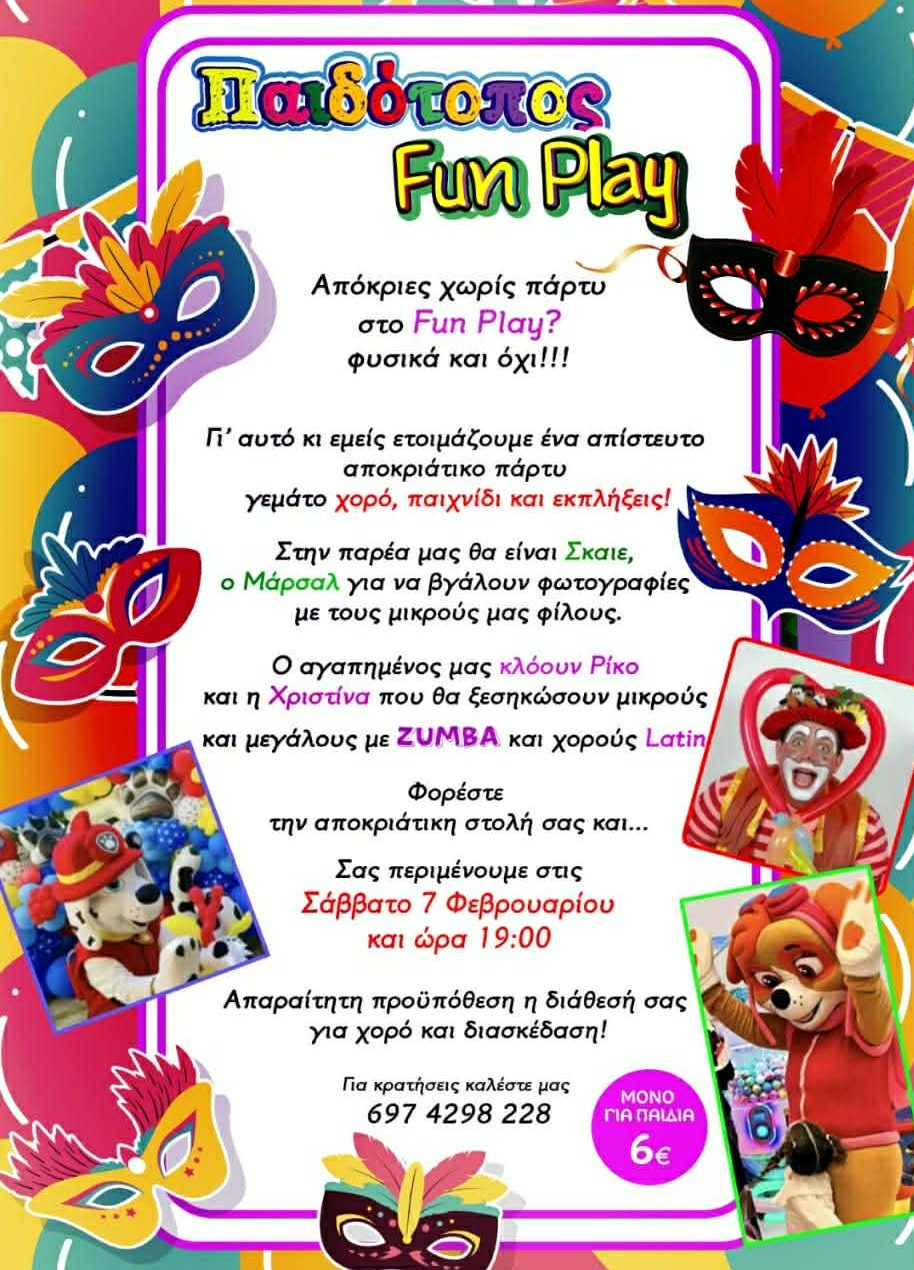 Απόκριες χωρίς πάρτι δεν γίνεται και ο Παιδότοπος Fun Play ετοιμάζει μια ξεχωριστή αποκριάτικη βραδιά για παιδιά, γεμάτη παιχνίδι, χορό και πολλές εκπλήξεις.
