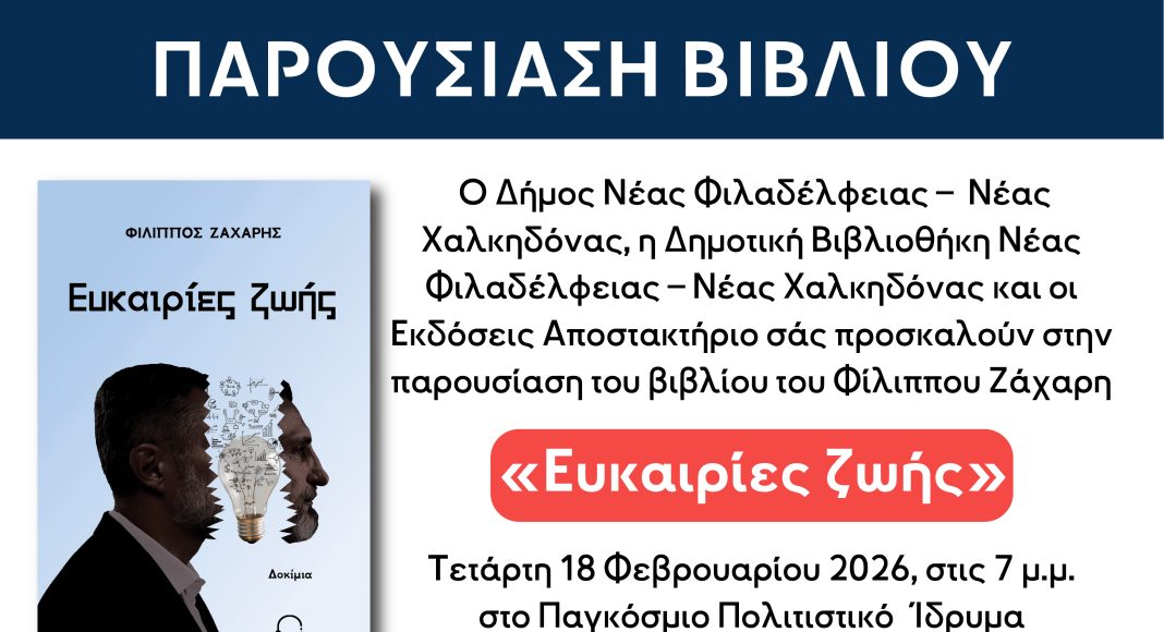 Η παρουσίαση βιβλίου «Ευκαιρίες Ζωής» του φιλολόγου και δημοσιογράφου Φίλιππου Ζάχαρη πραγματοποιείται στη Νέα Φιλαδέλφεια, σε μια εκδήλωση ανοιχτή για το κοινό. Ο Δήμος Νέας Φιλαδέλφειας – Νέας Χαλκηδόνας, η Δημοτική Βιβλιοθήκη και οι Εκδόσεις Αποστακτήριο συνδιοργανώνουν μια βραδιά αφιερωμένη στη λογοτεχνία και τον στοχασμό.