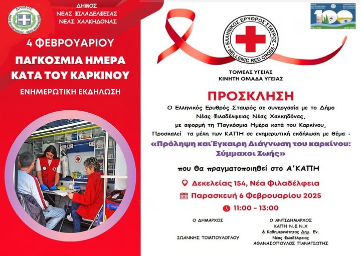 Ο Ελληνικός Ερυθρός Σταυρός (#ΕΕΣ) και το Τμήμα Κοινωνικής Πολιτικής & Προαγωγής της Δημόσιας Υγείας του Δήμος Νέας Φιλαδέλφειας – Νέας Χαλκηδόνας με αφορμή την Παγκόσμια Ημέρα Κατά του Καρκίνου (4 Φεβρουαρίου), διοργανώνουν ενημερωτική εκδήλωση για τα μέλη των #ΚΑΠΗ, με θέμα «Πρόληψη και Έγκαιρη Διάγνωση του Καρκίνου: Σύμμαχοι Ζωής».