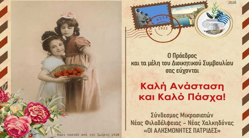 Με αίσθημα σεβασμού στην παράδοση και τις ρίζες της Μικρασιατικής μνήμης, ο Σύνδεσμος Μικρασιατών Νέας Φιλαδέλφειας – Νέας Χαλκηδόνας «Αλησμόνητες Πατρίδες» απευθύνει τις θερμότερες ευχές του προς όλους τους κατοίκους της πόλης και όχι μόνο, με αφορμή τις Άγιες Ημέρες του Πάσχα.